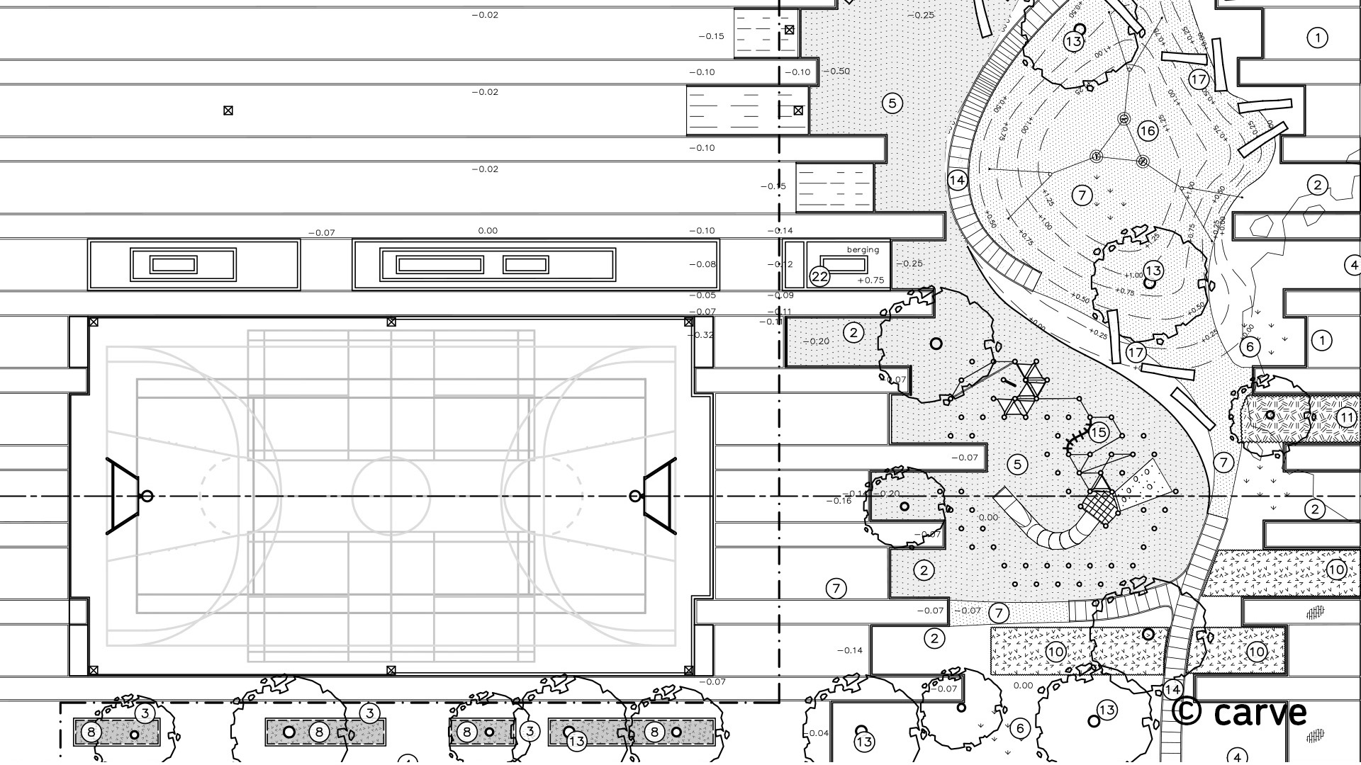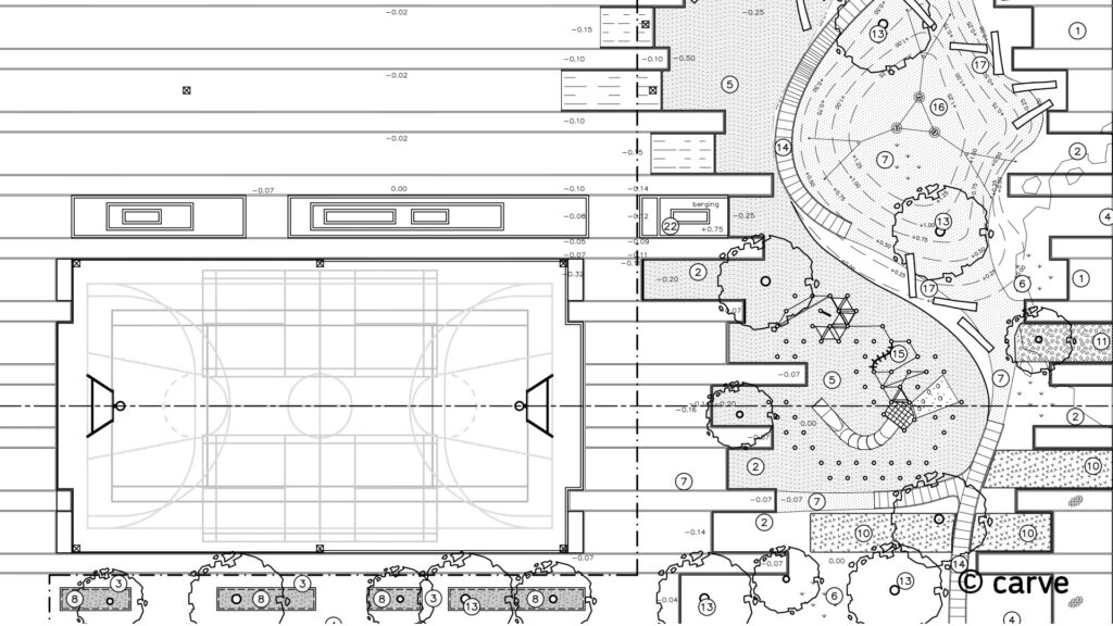 Voor dit project heb ik op basis van het voorontwerp het plein verder uitgewerkt. Ik heb bestektekeningen gemaakt en enkele speeltoestellen en hekwerken uitgewerkt. Tevens heb ik het civiele en het groenbestek opgesteld.