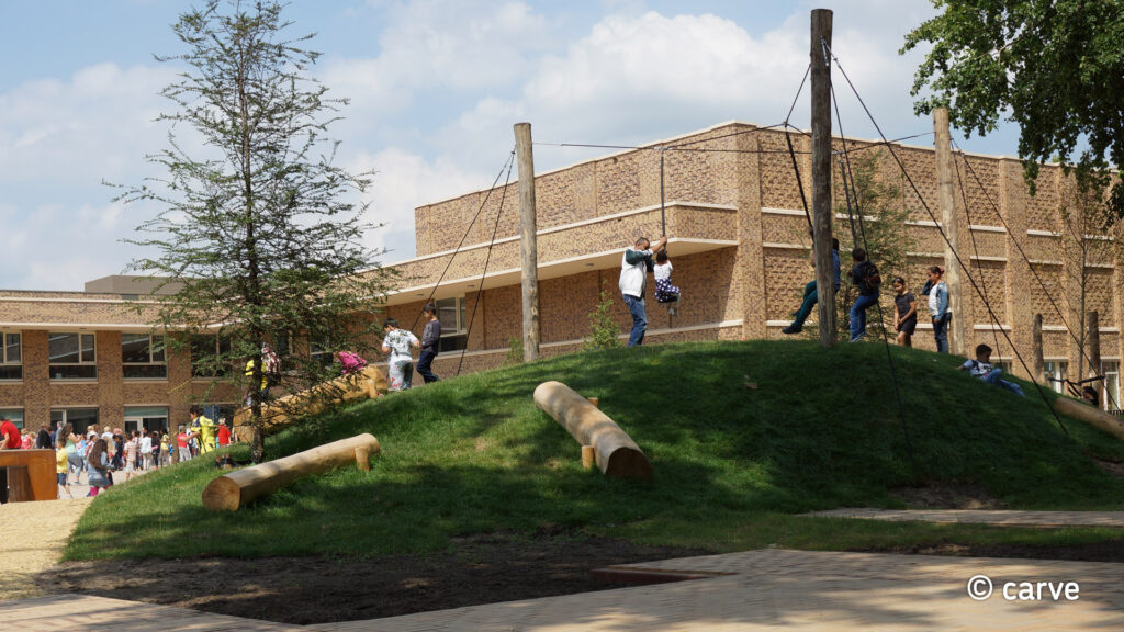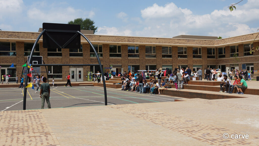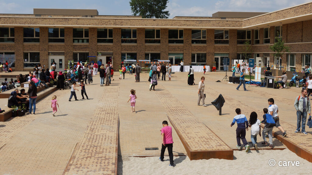 Ontwerp van een “dorpsplein in de buurt”. Een schoolplein verbonden met de omliggende wijk. Het plein heeft een harde zijde met verharding die aansluit op het schoolgebouw en een zachte zijde met speeltoestellen in het groen.
