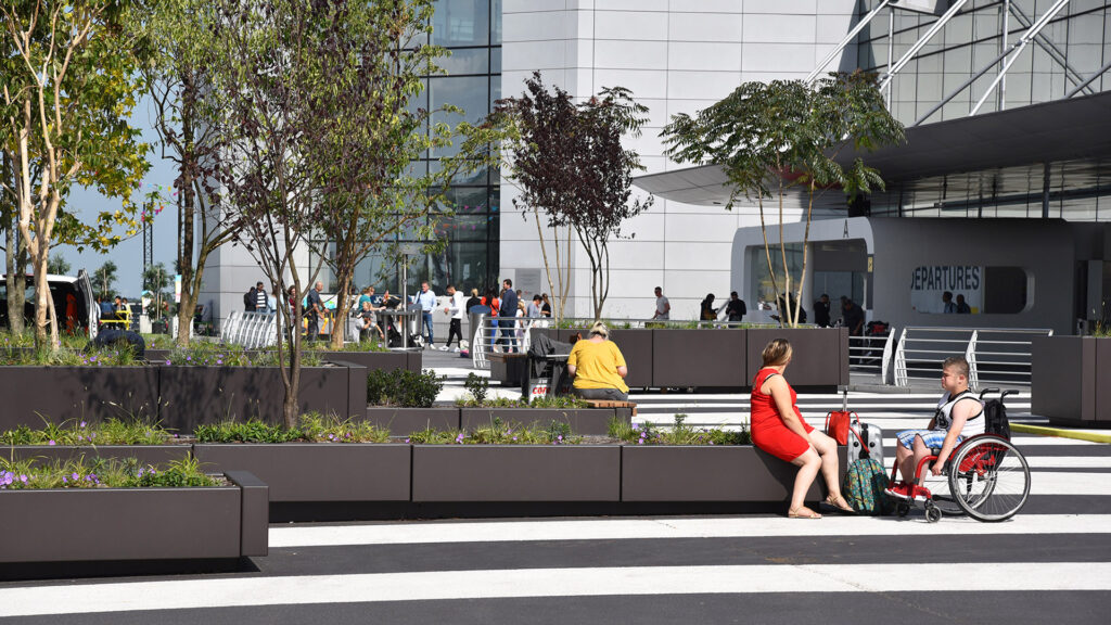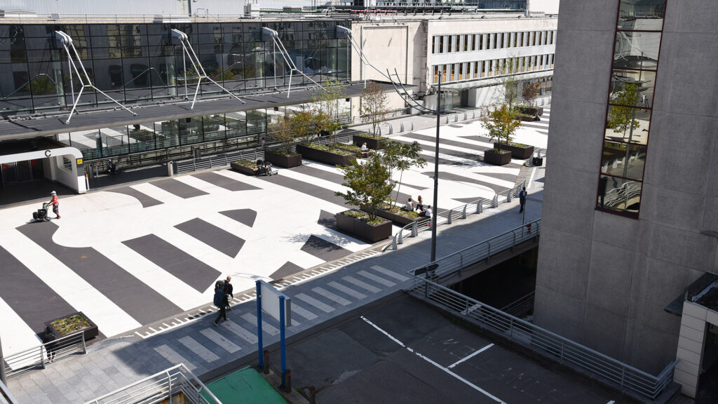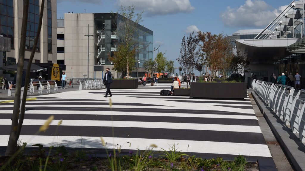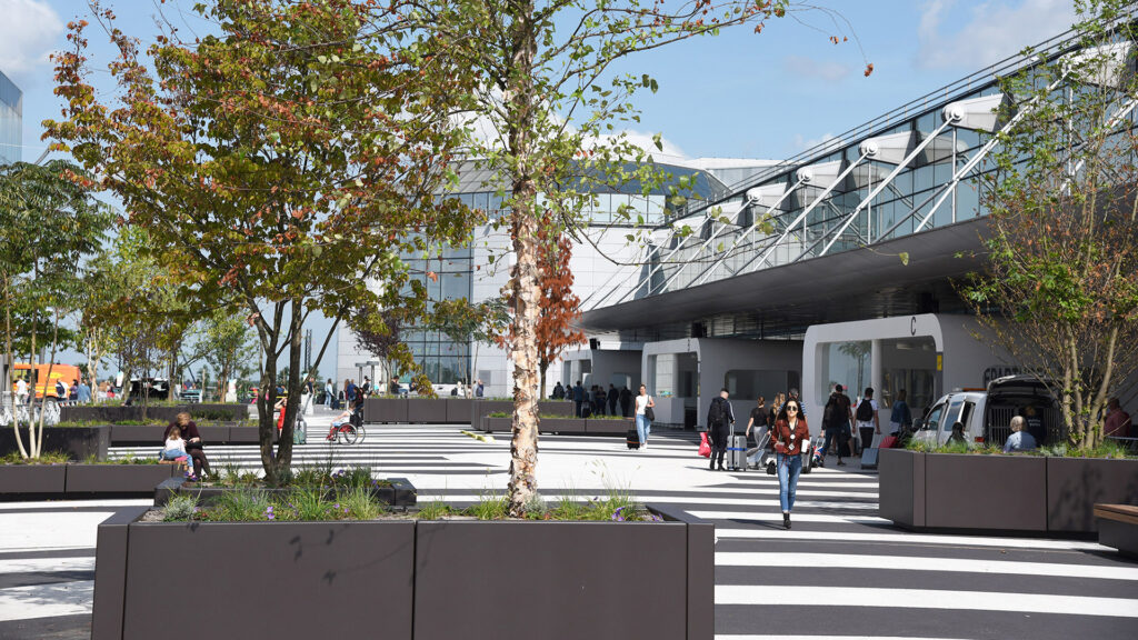 Herinrichting van het entreeplein van Brussels Airport. Deze verkeersruimte op een parkeerdak is met behulp van een afwisselend patroon van wegenverf getransformeerd tot een bijzondere visitekaartje voor de luchthaven. Met behulp van verplaatsbare boombakken is een aantrekkelijke groene verblijfsruimte ontstaan. Ik was binnen dit project verantwoordelijk voor het technisch ontwerp en de begeleiding van de uitvoer.