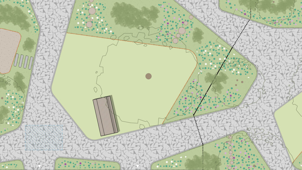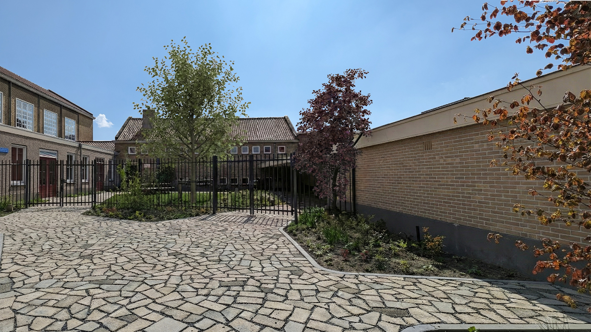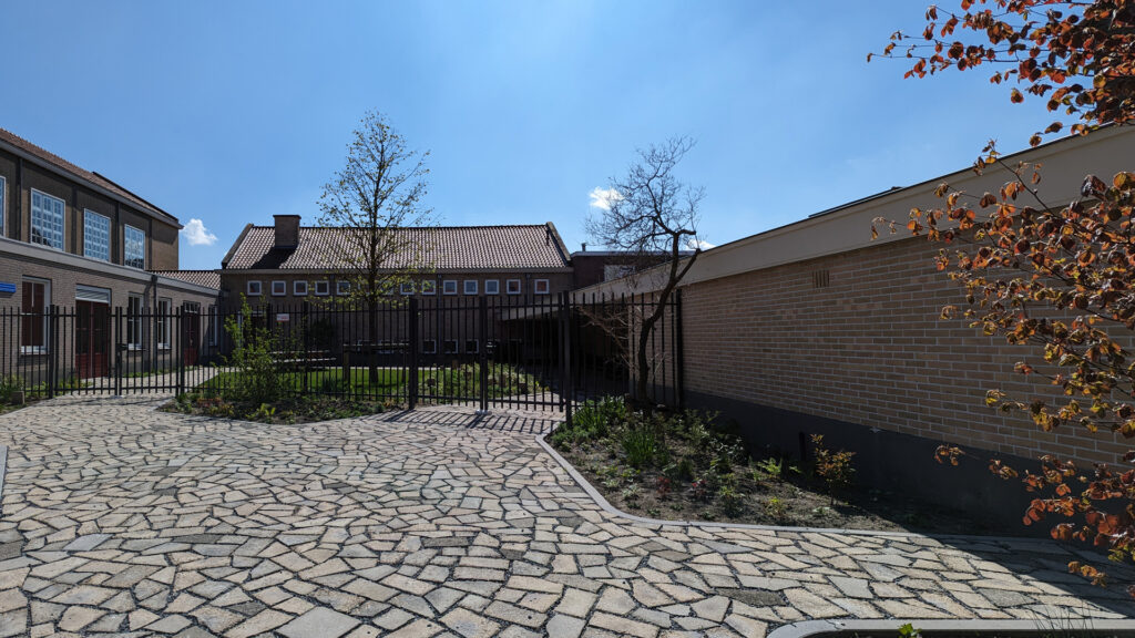 Dit vraagt om een betere inrichting van de buitenruimte. Hoewel het entreegebied al groen en uitnodigend is, ligt de focus op het herinrichten van het stenige binnenterrein. Bieke Van Hees Landschapsarchitectuur heeft een schetsontwerp gemaakt en LAIKA heeft dit verder uitgewerkt tot een uitvoerbaar plan, een directieraming opgesteld en de aanbesteding van de uitvoer begeleid.